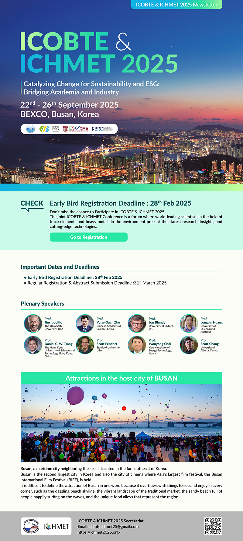 미량원소 생지화학 분야의 세계 최대 국제학회인 ISTEB 주관으로 국제학술대회(ICOBTE) 및 환경 중 중금속 관련 국제학술대회(ICHMET)가 개최될 예정입니다.