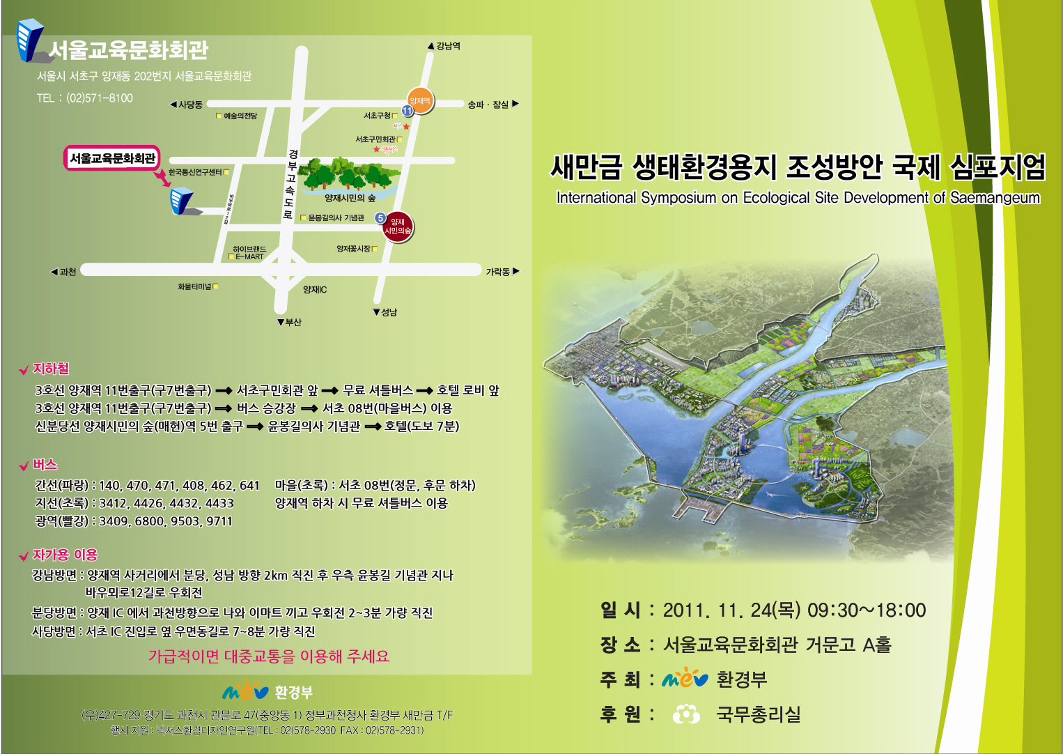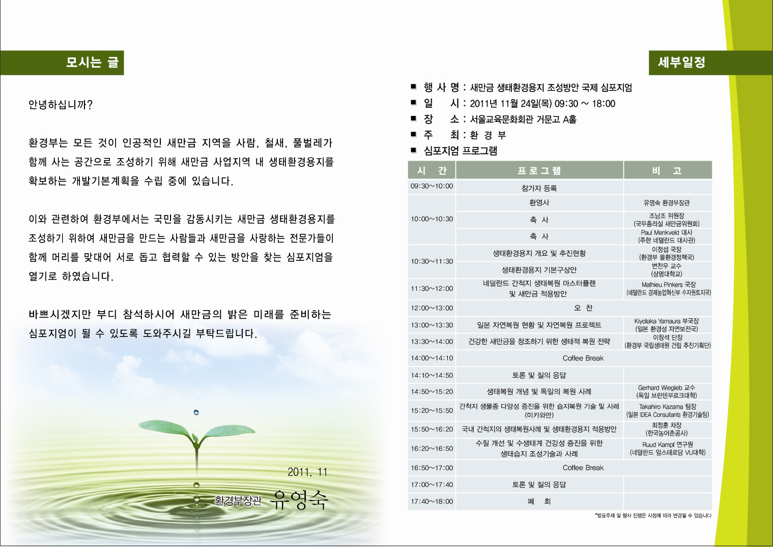 네덜란드, 독일, 일본 등 세계 각국에서 추진한 간척지 생태복원 정책과 노하우를 상호 공유하고 새만금의 친환경 개발을 위한 대안과 해안을 제시하는 의미 있는 자리가 될 것입니다.