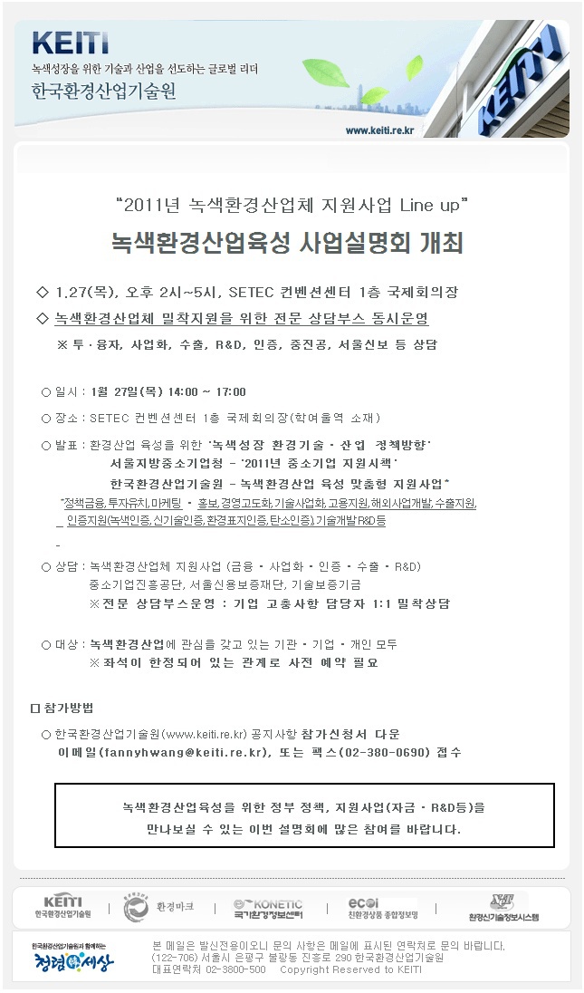 한국환경산업기술원에서는 녹색환경산업체를 대상으로 정부의 녹색성장 정책 및 지원사업에 대한 안내와 기업 의견수렴의 장을 마련하고자 아래와 같이 설명회를 개최하오니 관련협회 및 소속 기업체들의 많은 관심을 부탁드립니다.